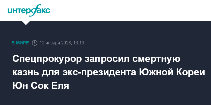 Москва. 13 января. INTERFAX.RU - Команда специального прокурора Чо Ын Сока во вторник запросила смертный приговор для бывшего президента Южной Кореи Юн Сок Еля по делу о введенном им военном положении, сообщает агентство Yonhap.