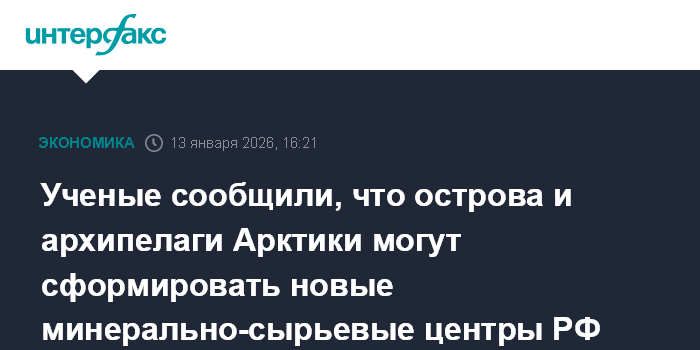 Москва. 13 января. INTERFAX.RU - Острова и архипелаги, расположенные в российской Арктике, могут в ближне- и среднесрочной перспективе сформировать как минимум три новых минерально-сырьевых центра (МСЦ), поскольку они обеспечены значительными ресурсами твердых полезных ископаемых и единой транспортной основой - Северным морским путем.