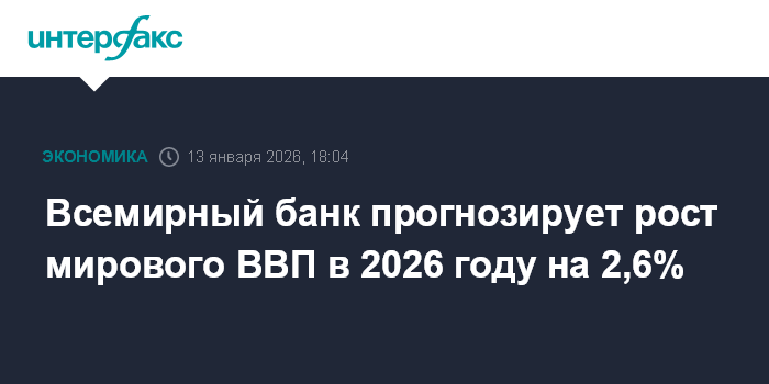Москва. 13 января. INTERFAX.RU - Всемирный банк прогнозирует рост мировой экономики на 2,6% в 2026 году и на 2,7% в 2027 году, говорится в декабрьском докладе "Глобальные экономические перспективы".