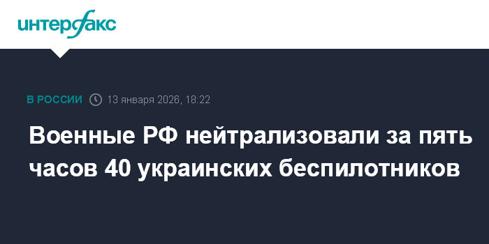 Москва. 13 января. INTERFAX.RU - Российские военнослужащие в период с 13:00 до 18:00 мск перехватили и уничтожили 40 украинских беспилотников самолетного типа, 22 из них - над Крымом, сообщили в Минобороны РФ во вторник.
