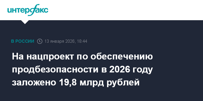 Москва. 13 января. INTERFAX.RU - Федеральный бюджет в 2026 году предусматривает 19,8 млрд рублей на нацпроект "Технологическое обеспечение продовольственной безопасности", сообщает Минсельхоз.