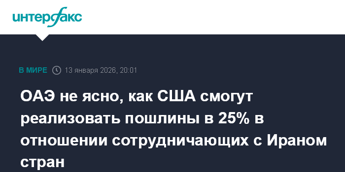 Москва. 13 января. INTERFAX.RU - В ОАЭ пока не представляют, как США будут воплощать в жизнь решение президента Дональда Трампа ввести пошлины в 25% в отношении стран, сотрудничающих с Ираном, заявил во вторник министр по внешней торговле Эмиратов Тани бин Ахмед аль-Зейуди.