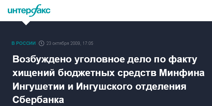 Москва. 23 октября. INTERFAX.RU - Следственными органами Следственного комитета при прокуратуре РФ по Республике Ингушетия возбуждено уголовное дело по факту хищения бюджетных средств Министерства финансов республики и Ингушского отделения сберегательного банка по признакам преступлений, предусмотренных ч. 1 ст. 285 УК РФ (нецелевое расходование бюджетных средств) и ч. 4 ст. 159 УК РФ (мошенничество, совершенное в особо крупном размере), сообщили "Интерфаксу" в управлении взаимодействия со средствами массовой информации СКП РФ в пятницу.