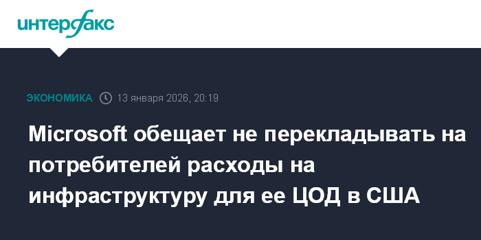 Москва. 13 января. INTERFAX.RU - Американская Microsoft Corp. запускает инициативу по развитию ИИ-инфраструктуры в США с учетом общественных интересов и обещает самостоятельно покрывать расходы на энергоинфраструктуру для ее ЦОД в США, говорится в ее блоге.