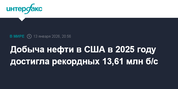 Москва. 13 января. INTERFAX.RU - Добыча нефти в Соединенных Штатах Америки в 2025 году достигла рекордных 13,61 млн б/с, говорится в ежемесячном отчете управления энергетической информации (EIA) Минэнерго страны.