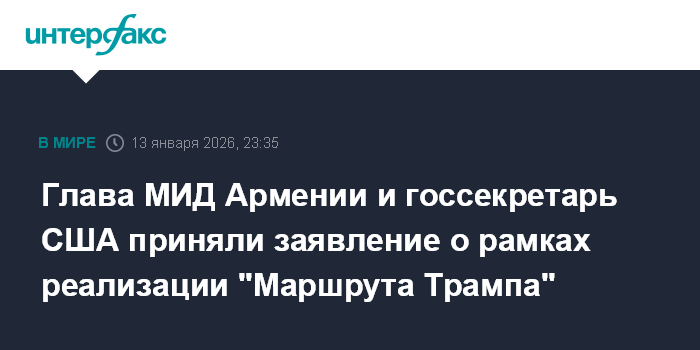 Москва. 13 января. INTERFAX.RU - Глава МИД Армении Арарат Мирзоян и госсекретарь США Марко Рубио во вторник в Вашингтоне утвердили совместное заявление о рамках реализации проекта TRIPP.