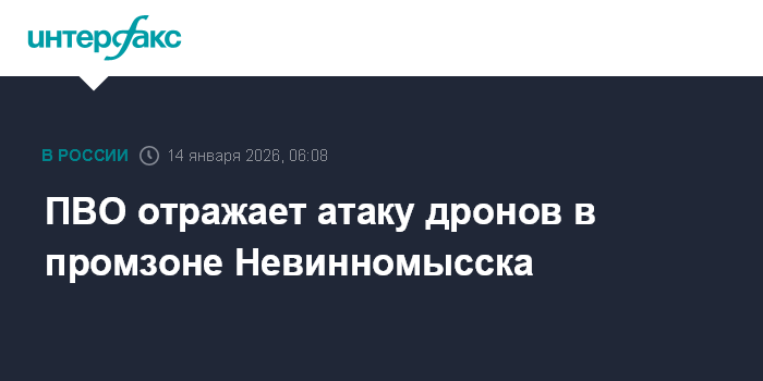 Москва. 14 января. INTERFAX.RU - Атака украинских беспилотников происходит в промышленной зоне в городе Невинномысск Ставропольского края, сообщил утром в среду губернатор региона Владимир Владимиров.