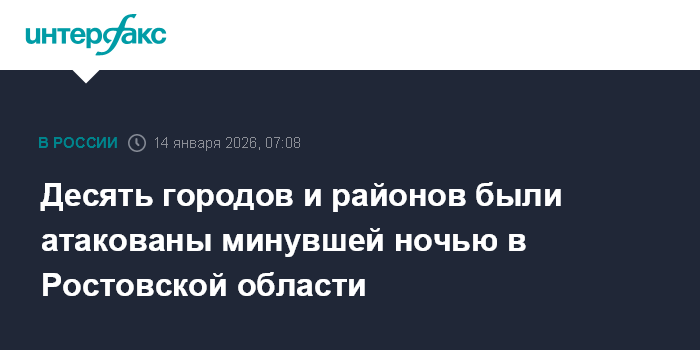 Москва. 14 января. INTERFAX.RU - Губернатор Ростовской области Юрий Слюсарь сообщил, что в ночь на среду в регионе были атакованы десять городов районов.