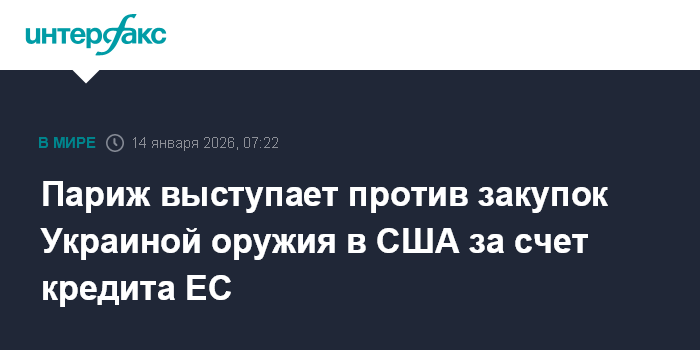 Москва. 14 января. INTERFAX.RU - Франция пытается помешать закупкам оружия для Украины в США за счет кредита Евросоюза, сообщает The Telegraph.