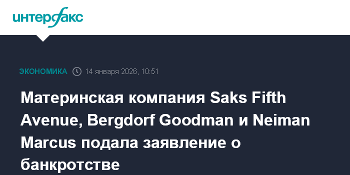 Москва. 14 января. INTERFAX.RU - Американская Saks Global, материнская компания ритейлеров Saks Fifth Avenue, Bergdorf Goodman и Neiman Marcus, подала заявление о банкротстве в суд штата Техас. Как говорится в пресс-релизе компании, эта мера поможет ей ускорить процесс преобразований.