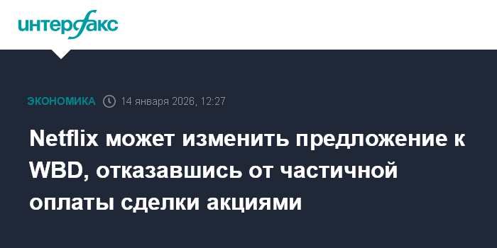 Москва. 14 января. INTERFAX.RU - Netflix Inc. работает над пересмотром условий предложения о покупке активов Warner Bros. Discovery Inc. (WBD), рассматривая возможность полной оплаты сделки денежными средствами, пишет газета The Wall Street Journal со ссылкой на информированные источники.
