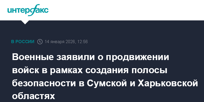 Москва. 14 января. INTERFAX.RU - Российская армия взяла под контроль село Комаровка и продвигается в глубину украинской обороны, создавая полосу безопасности в Сумской и Харьковской областях, сообщило Минобороны РФ в среду.