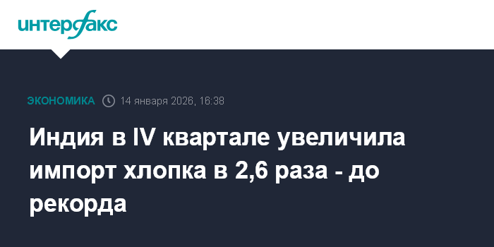 Москва. 14 января. INTERFAX.RU - Индия в октябре-декабре 2025 года увеличила импорт хлопка в 2,6 раза (на 158%) в годовом измерении - до рекордных 3,1 млн тюков (по 170 кг каждый), сообщает Reuters со ссылкой на Ассоциацию производителей хлопка Индии (CAI).