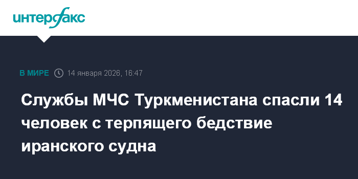 "14 января 2026 года береговыми службами Туркменистана на Каспийском море был получен сигнал SOS от терпящего бедствие иранского сухогруза Rona. Государственными органами Туркменистана, деятельность которых связана с ликвидацией и предотвращением чрезвычайных ситуаций, согласно международным нормам, регламентирующим правила мореплавания, были предприняты все необходимые меры по спасению людей", - сообщил МИД.