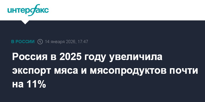 Москва. 14 января. INTERFAX.RU - Россия в 2025 году экспортировала свыше 911 тыс. тонн мяса и мясопродуктов, что на 10,6% больше, чем в 2024 году, сообщает Россельхознадзор со ссылкой на данные информсистемы "ВетИС".