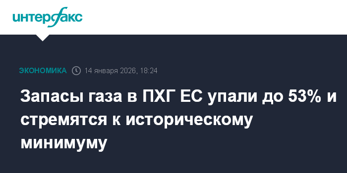 Средний уровень запасов газа в подземных хранилищах Европы опустился до 53,17% по итогам газовых суток 12 января (на утро вторника), свидетельствуют данные Gas Infrastructure Europe.