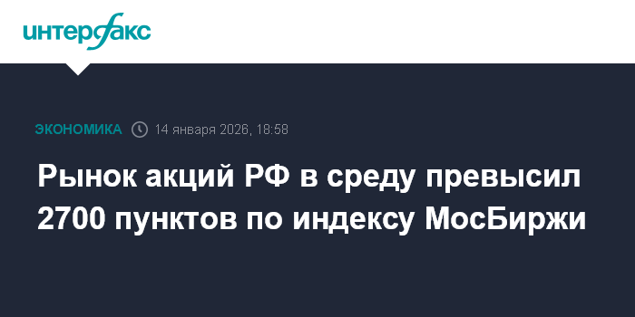 Москва. 14 января. INTERFAX.RU - Российский рынок акций в среду скорректировался вверх на сообщениях западных СМИ о планах продолжения мирных переговоров США и России по украинскому урегулированию, также поддержку оказала продолжившая подъем нефть (фьючерс на Brent вырос до $66 за баррель). Индекс МосБиржи превысил рубеж 2700 пунктов после утреннего снижения до 2674 пунктов.