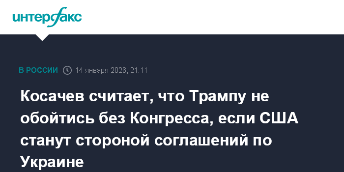 Москва. 14 января. INTERFAX.RU - Если США станут стороной юридически обязывающих соглашений по Украине, президенту Дональду Трампу не удастся обойтись без участия Конгресса, считает вице-спикер Совета Федерации Константин Косачев.