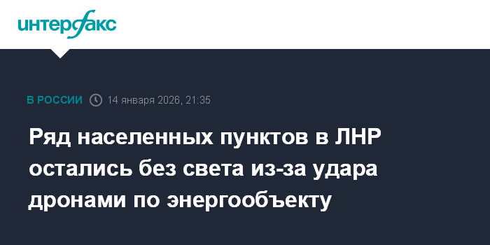 Москва. 14 января. INTERFAX.RU - Ряд населенных пунктов Краснодонского и Свердловского муниципальных округов Луганской Народной Республики остались без электроснабжения в результате удара беспилотников по объекту энергетики и его возгорания, сообщили в министерстве топлива, энергетики и угольной промышленности ЛНР.