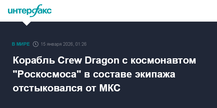 Москва. 15 января. INTERFAX.RU - Пилотируемый корабль Crew Dragon с миссией Crew-11 в четверг по московскому времени расстыковался с Международной космической станцией (МКС) для возвращения на Землю, сообщило NASA.