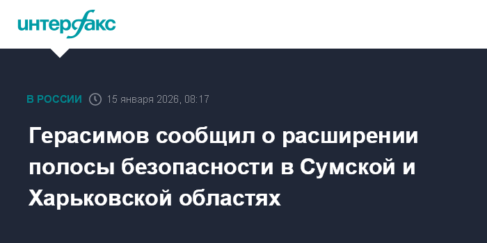 Москва. 15 января. INTERFAX.RU - Российские военные продолжают расширять зону безопасности в Сумской и Харьковской областях Украины, заявил на совещании на пункте управления группировки "Центр" начальник Генштаба ВС России Валерий Герасимов.