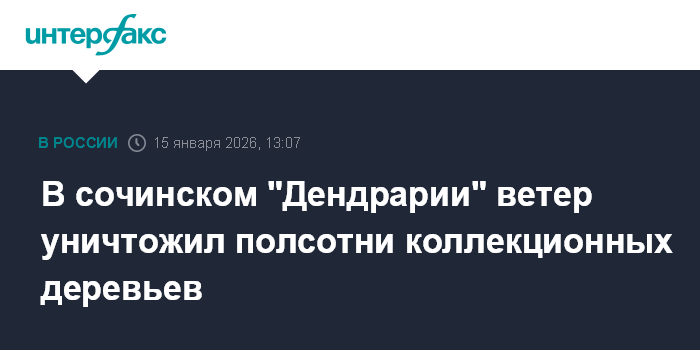 Москва. 15 января. INTERFAX.RU - В Сочи сильный ветер уничтожил в парке "Дендрарий" больше полусотни коллекционных деревьев, которые представляли научную ценность, сообщили "Интерфаксу" в пресс-службе парка.