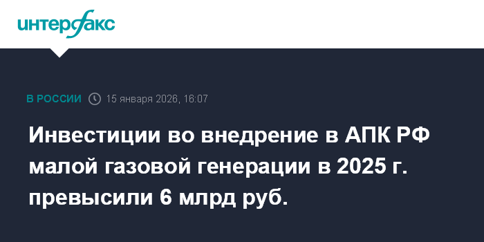 Инвестиции во внедрение в АПК РФ малой газовой генерации в 2025 г. превысили 6 млрд руб.