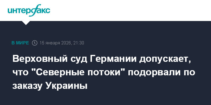 Москва. 15 января. INTERFAX.RU - Федеральный верховный суд Германии обнародовал постановление от 10 декабря 2025 года, в котором говорится, что подрывы на газопроводах "Северный поток-1" и "Северный поток-2" с высокой вероятностью могли быть заказаны иностранным государством, в частности, Украиной, сообщает в четверг журнал Der Spiegel.