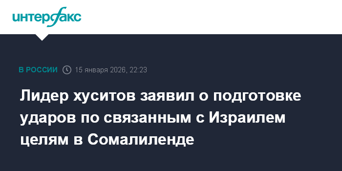 Москва. 15 января. INTERFAX.RU - Лидер хуситов Абдул-Малик аль-Хуси заявил, что их группировка "Ансар Аллах" ведет подготовку к возможным действиям против Израиля на территории сомалийского региона Сомалиленд.