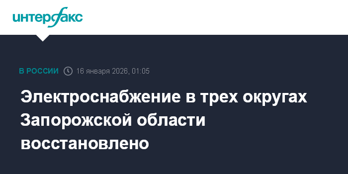 Москва. 16 января. INTERFAX.RU - Электроснабжение Михайловского, Васильевского и Токмакского муниципальных округов Запорожской области восстановлено, сообщил глава региона Евгений Балицкий.