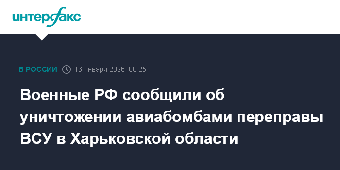 Москва. 16 января. INTERFAX.RU - Российская авиация уничтожила переправу через реку Оскол в районе Осиново в Харьковской области, сообщило Минобороны РФ в пятницу.