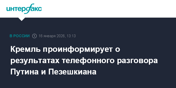Москва. 16 января. INTERFAX.RU - В Кремле пообещали в самое ближайшее время проинформировать о результатах телефонного разговора президентов РФ и Ирана Владимира Путина и Масуда Пезешкиана.