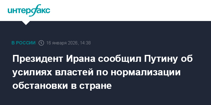 Москва. 16 января. INTERFAX.RU - В ходе телефонного разговора президент Исламской Республики Иран Масуд Пезешкиан проинформировал президента России Владимира Путина о предпринимаемых иранским руководством активных усилиях по нормализации обстановки в стране, сообщает в пятницу пресс-служба Кремля.