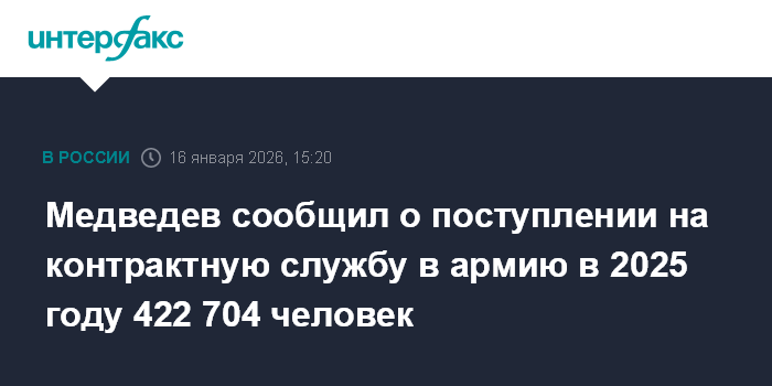 Москва. 16 января. INTERFAX.RU - В 2025 году 422 704 человека заключили контракт на прохождение военной службы , еще 32 тысячи стали добровольцами, заявил на совещании по комплектованию войск беспилотных систем зампред Совбеза Дмитрий Медведев.