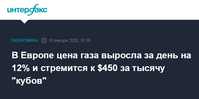 Москва. 16 января. INTERFAX.RU - Новые прогнозы о морозах в Европе подстегивают цены на газ. В пятницу на эталонном европейском хабе TTF торги с поставкой "на день вперед" достигли $447 за тысячу кубометров при том, что в четверг котировки закрылись на уровне $401.