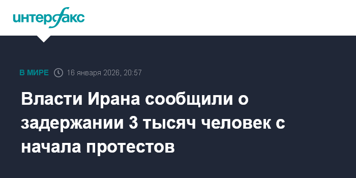 Москва. 16 января. INTERFAX.RU - В Иране за время протестов спецслужбы задержали не менее трех тысяч человек, в том числе участников беспорядков и подозреваемых в участии в террористических группировках, сообщает EFE со ссылкой на представителей иранских властей, которые, в свою очередь, ссылаются на данные спецслужб.