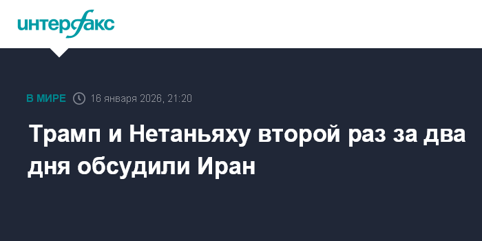 Москва. 16 января. INTERFAX.RU - Президент США Дональд Трамп и премьер-министр Израиля Биньямин Нетаньяху в четверг обсудили по телефону Иран, разговор лидеров стран на такую же тему прошел и в среду, сообщает Axios со ссылкой на два источника, информированные о втором разговоре.
