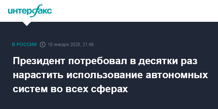 Москва. 16 января. INTERFAX.RU - Россия должна в десятки раз нарастить использование автономных систем во всех сферах жизни, поэтому неправильно ставить барьеры на пути развития технологий, заявил на совещании по развитию автономных систем президент Владимир Путин.