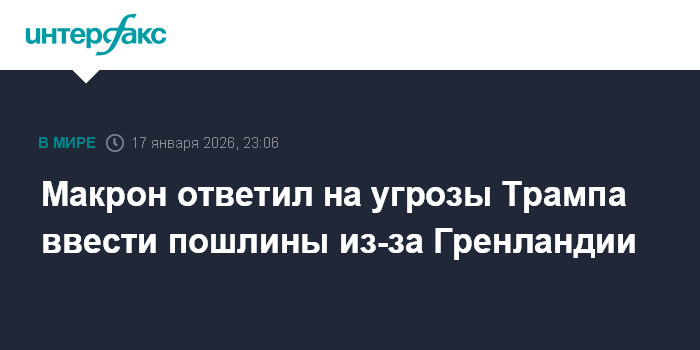 "Тарифные угрозы неприемлемы и недопустимы в данном контексте. Европейцы ответят на них единым и скоординированным образом, если они подтвердятся. Мы обеспечим уважение европейского суверенитета. Именно в этом духе я буду говорить с нашими европейскими партнерами", - написал Макрон в соцсети X в субботу вечером.