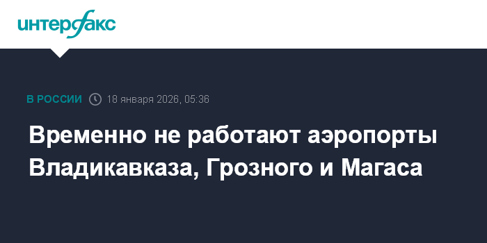 Москва. 18 января. INTERFAX.RU - Приостановили обслуживание рейсов аэропорты Владикавказа (Беслан), Грозного (Северный) и Магаса, сообщил представитель Росавиации Артем Кореняко.
