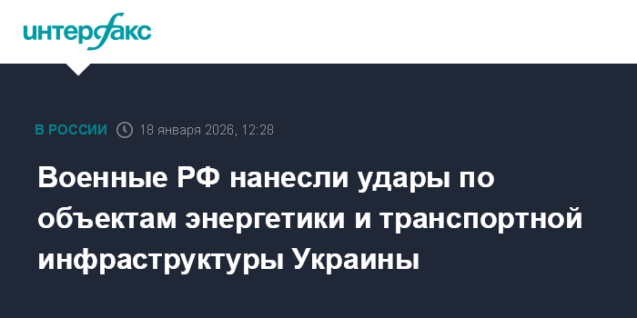 Москва. 18 января. INTERFAX.RU - Российские военные нанесли очередные удары по используемым в интересах ВСУ объектам энергетики и транспортной инфраструктуры Украины, а также по предприятиям сборки беспилотников дальнего действия, сообщили в Минобороны РФ в воскресенье.