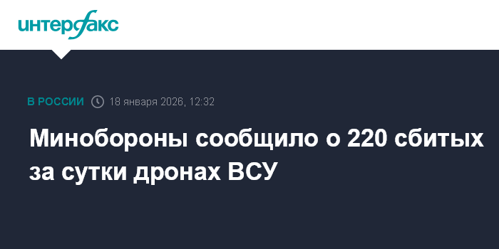 Москва. 18 января. INTERFAX.RU - Средства ПВО за сутки сбили 220 украинских беспилотников самолетного типа, сообщило Минобороны РФ в воскресенье.