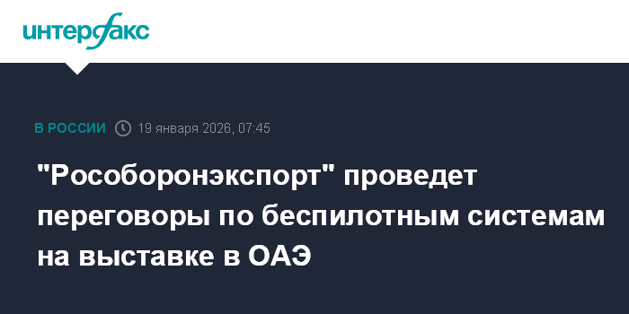 Москва. 19 января. INTERFAX.RU - "Рособоронэкспорт" представит отечественные беспилотники на выставке UMEX&SIMTEX 2026 в ОАЭ и проведет переговоры с делегациями ближневосточных и других стран-участниц форума, сообщили в компании в понедельник.
