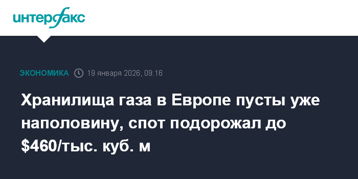 Хранилища газа в Европе пусты уже наполовину, спот подорожал до $460/тыс. куб. м