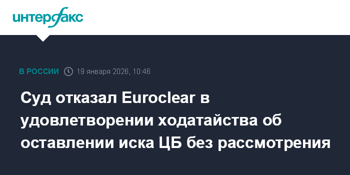Москва. 19 января. INTERFAX.RU - Арбитражный суд Москвы отказал бельгийскому Euroclear в удовлетворении ходатайства об оставлении иска ЦБ РФ к депозитарию без рассмотрения, следует из картотеки арбитражных дел.