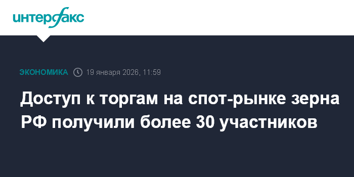 Москва. 19 января. INTERFAX.RU - Доступ к торгам на спот-рынке зерна, стартовавшим на Национальной товарной бирже (НТБ) в понедельник, уже получили более 30 участников зернового рынка, сообщает торговая площадка.