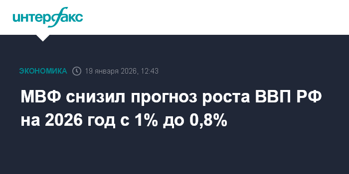 Москва. 19 января. INTERFAX.RU - Международный валютный фонд (МВФ) ухудшил свой прогноз роста российской экономики в 2026 году на 0,2 п.п. - до 0,8% с 1%, ожидавшихся им в октябре. Очередной обзор мировой экономики (World Economic Outlook Update) опубликован фондом в понедельник.