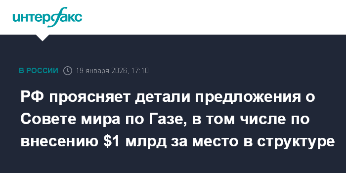 РФ проясняет детали предложения о Совете мира по Газе, в том числе по внесению $1 млрд за место в структуре
