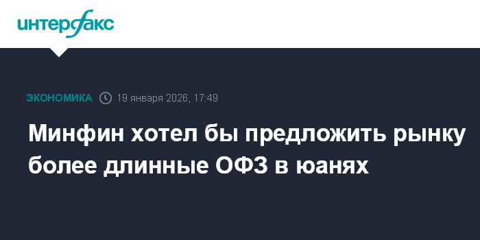 Москва. 19 января. INTERFAX.RU - Минфин хотел бы предложить рынку более длинные ОФЗ в юанях - со сроками обращения пять и даже десять лет - если будет спрос на инструменты с такой дюрацией, сообщил РБК ТВ директор департамента государственного долга и государственных финансовых активов ведомства Денис Мамонов.