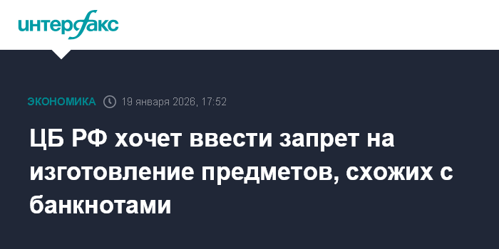 Москва. 19 января. INTERFAX.RU - Банк России хочет запретить изготовление предметов, схожих по форме с банкнотами и монетами, а также ввести административную ответственность за это, следует из основных направлений развития наличного денежного обращения на 2026-2030 годы, опубликованного на сайте ЦБ.